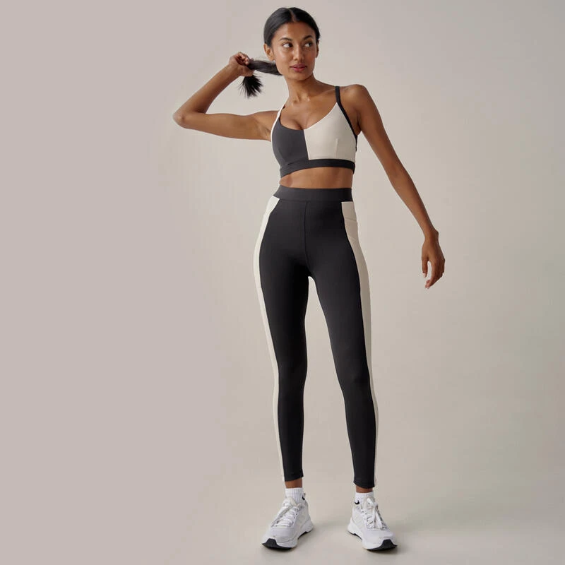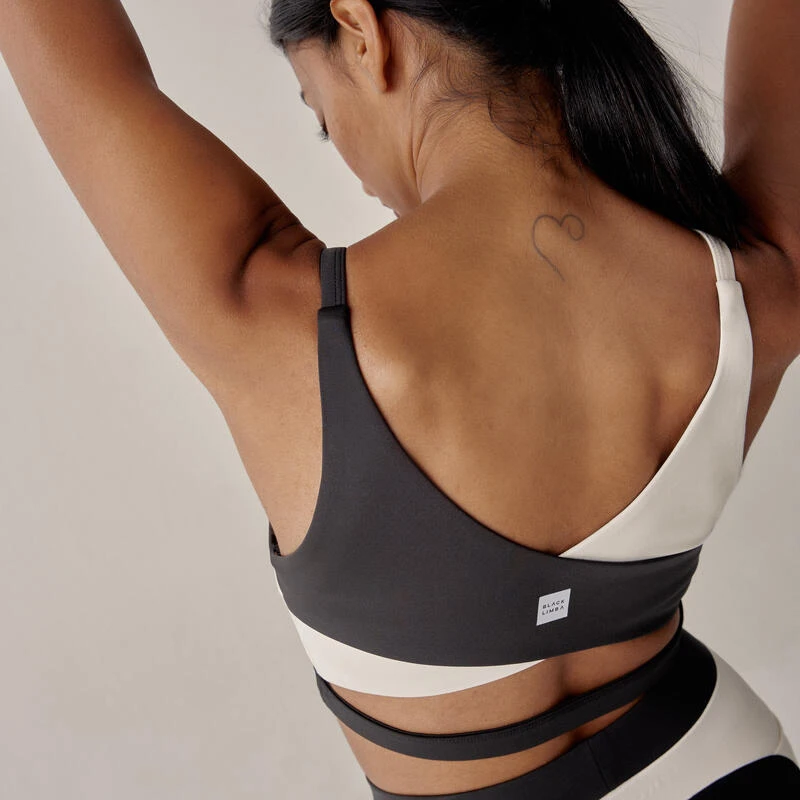 Vous aimez les combinaisons de couleurs ? Ce haut est pour vous. Un haut bicolore, de maintien moyen, de type dos nu, avec des bonnets amovibles légèrement rembourrés. Dos croisé avec fentes.