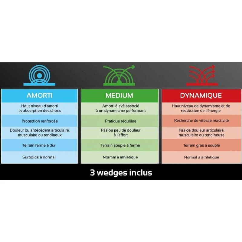 Ces chaussures de running femme s’adaptent à votre pratique grâce aux 3 wedges inclus (Amorti-Médium-Dynamique).