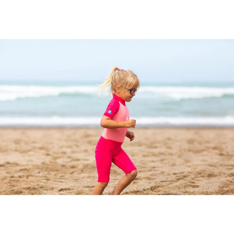 La combinaison de natation anti UV bébé manches courtes en matière recyclée qui protège des UV même dans l’eau et s’enfile facilement grâce aux pressions à l’arrière du col et à l’entrejambe.